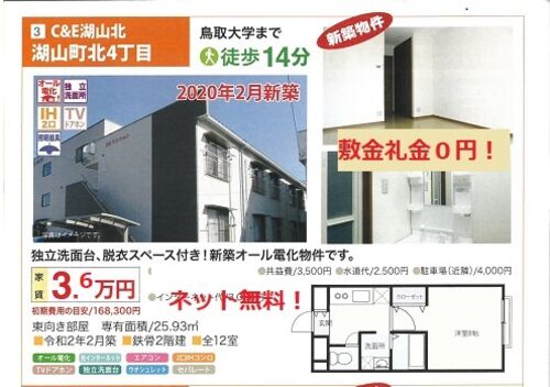 **************************** エル・オフィス 2月~3月は、休まず営業中! ******************************** 鳥取大学生協 では、紹介されない 敷金礼金0円物件! こんな人気物件を、初期…